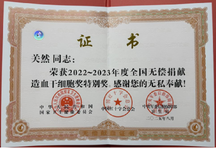 二是坚持无私奉献。除两次造血干细胞捐献外,关然老师长期坚持无偿献血,累计献血达47次,总量17000毫升。她将此视为一种习惯和与社会的温情联结。