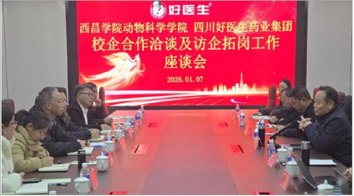 为深化产教融合、精准对接产业需求、拓宽学生就业渠道,2026年1月7日,动物科学学院党委书记孙德刚、院长黄志秋率领导班子及部分专任教师,赴好医生药业集团开展校企合作洽谈及访企拓岗专项活动。集团副董事长耿福昌携相关部门负责人热情接待,双方围绕协同育人、就业实习、科研攻关、服务区域发展等核心议题深入交流,达成系列合作共识。
