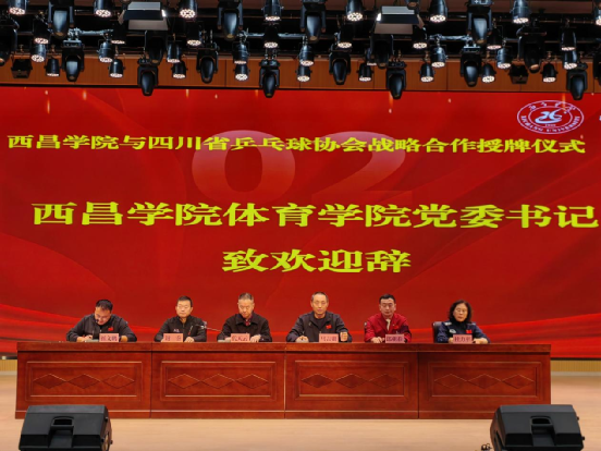 为深入落实立德树人根本任务,落实国家体育发展战略,推动乒乓球运动在高校的普及与优秀人才培养,2025年11月6日上午,西昌学院与四川省乒乓球协会在学生事务活动中心成功举行战略合作授牌仪式。中国乒乓球协会裁判委员会副主任、四川省乒乓球协会党支部书记兼秘书长代天云,四川省乒乓球协会副秘书长、省裁委会主任谢蓥,四川省乒乓球协会裁判委员会副主任杜力平,西昌学院体育学院党委书记马吉勋、院长郎朝春、办公室主任崔文鹏,以及体育学院全体在校教师和部分学生代表参加仪式。仪式由崔文鹏主持。