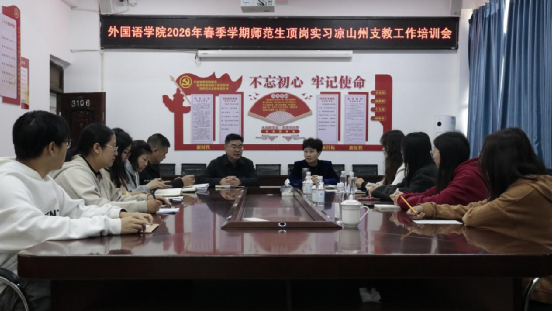 为提升师范生顶岗支教能力,保障2026年春季学期凉山州支教工作顺利实施,我院于3月10日在弘毅楼会议室召开专项培训会。参加此次培训会的有外国语学院党委书记文宇、院长陈红梅、副院长陈怀志、教务科科长黄莺、学生科科长黄彩霞、支教指导教师蒋阿呷,学院“一站式”学生社区“译路向党”突击队员兼支教优秀学生代表黄怡鑫及本次支教全体学生,培训会由黄彩霞主持。