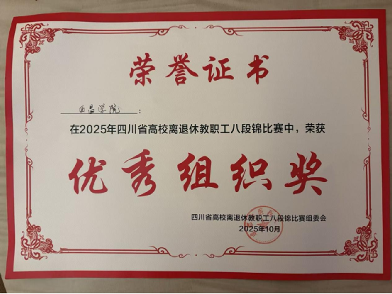 根据《四川省教育厅办公室关于举办2025年四川省高校离退休教职工八段锦比赛的通知》精神,由四川省教育厅主办,成都中医药大学承办的2025年四川省高校离退休教职工八段锦比赛于10月31日上午9:00在成都中医药大学温江校区体育馆拉开帷幕,此次比赛有来自全省27所高校八段锦队伍。西昌学院离退休工作处综合科副科长郑心怡、一般工作人员葛念带队,教练及运动员一行8人参加了比赛。  我校参赛队员本着“安全第一、重在参与、重在健康、重在交流、重在快乐”的原则,在赛场上团结一心、沉稳发挥,动作行云流水、自然流畅,展现出积极进取、蓬勃向上的精神风貌,赛出了西昌学院的水平和风格。在全省27所参赛高校中,获得了第十三名的好成绩,荣获优秀组织奖。  此次比赛,由四川省教育厅为八段锦爱好者提供了切磋技艺的良好平台。通过比赛,不仅增进了高校之间的友谊和交流,也提高了退休同志的身体素质,让他们享受退休幸福生活的同时,继续为助力学校教育事业改革发展贡献力量。   图: 葛念 / 文:葛念 一审一校:葛念 二审二校:郑璐 三审三校:杨六兰 |